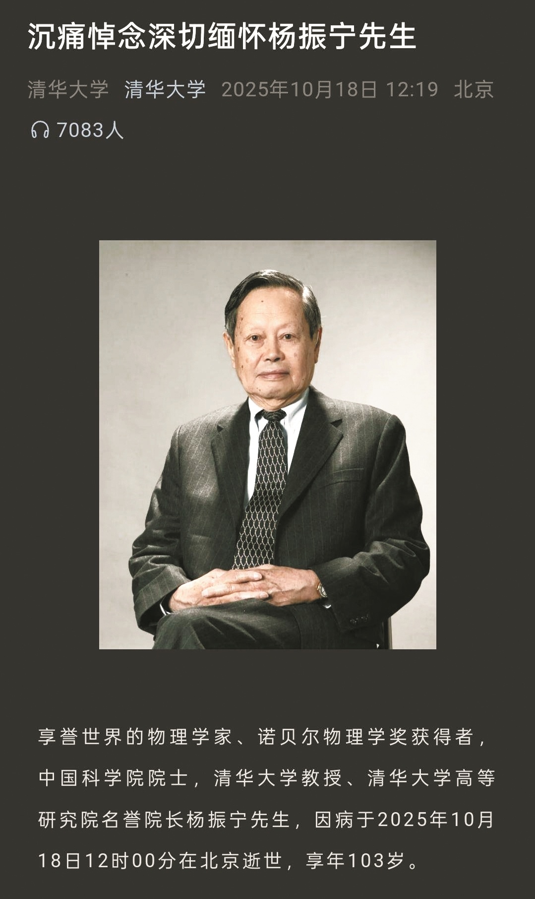 2025年10月18日,享譽世界的物理學(xué)家、諾貝爾物理學(xué)獎獲得者、中國科學(xué)院院士、清華大學(xué)教授、清華大學(xué)高等研究院名譽院長楊振寧先生逝世。極目新聞記者梳理發(fā)現(xiàn),截至19日晚上,目前國內(nèi)已有清華大學(xué)、北京大學(xué)、復(fù)旦大學(xué)、上海交通大學(xué)、華中科技大學(xué)等在內(nèi)的至少23所高校發(fā)文悼念。清華大學(xué)、香港中文大學(xué)等多所高校官網(wǎng)已變黑白。