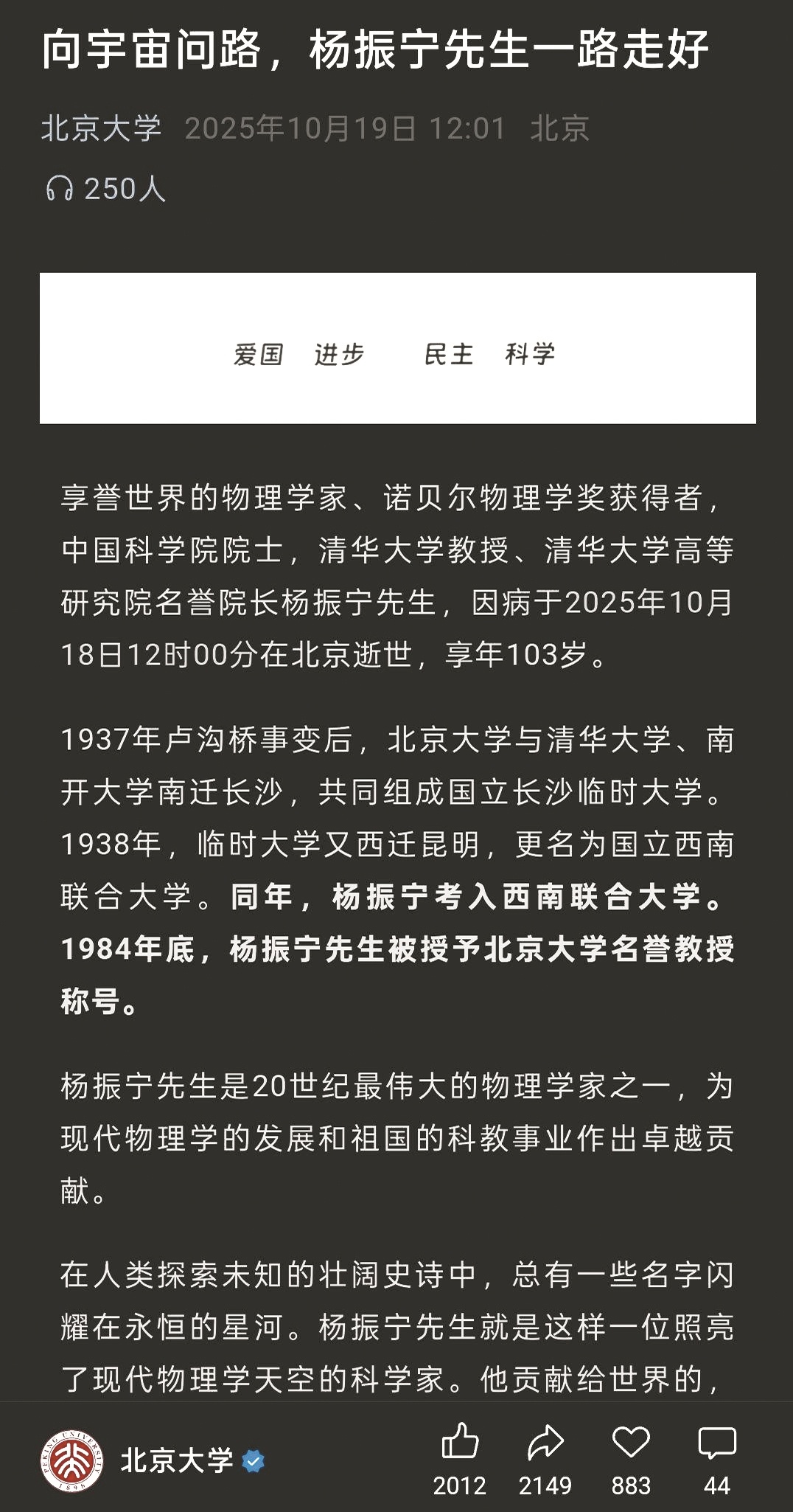 北京大學(xué)發(fā)文緬懷楊振寧先生 來源:學(xué)校官方微信