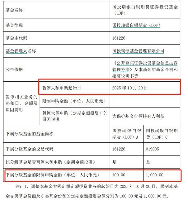 繼三天前限購后,國投瑞銀白銀期貨升級限購。自10月20日起,該基金A類和C類份額最新申購限額分別低至100元和1000元,較之前大幅調降。
