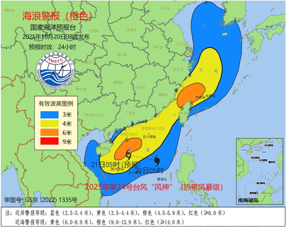 國家海洋預(yù)報(bào)臺(tái)根據(jù)《海洋災(zāi)害應(yīng)急預(yù)案》發(fā)布海浪橙色警報(bào)。受強(qiáng)冷空氣和今年第24號(hào)臺(tái)風(fēng)“風(fēng)神”(熱帶風(fēng)暴級(jí))的共同影響,預(yù)計(jì):10月20日上午到21日上午,東海南部、臺(tái)灣海峽、南海北部將出現(xiàn)5到7米的巨浪到狂浪區(qū),近海海域海浪預(yù)警級(jí)別為黃色;福建、海南東部近岸海域?qū)⒊霈F(xiàn)3到4.5米的大浪到巨浪,該近岸海域海浪預(yù)警級(jí)別為橙色,上海、浙江、廣東近岸海域?qū)⒊霈F(xiàn)2.5到4米的大浪到巨浪,該近岸海域海浪預(yù)警級(jí)別為黃色,江蘇南部、海南西部近岸海域?qū)⒊霈F(xiàn)2到3米的中浪到大浪,該近岸海域海浪預(yù)警級(jí)別為藍(lán)色。請(qǐng)?jiān)谏鲜龊S蜃鳂I(yè)的船只注意安全,沿海各有關(guān)單位提前采取防浪避浪措施。