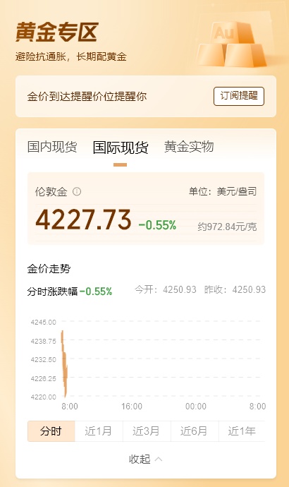 10月20日,現貨黃金走低跌破4230美元/盎司,現報4225美元/盎司,較日高下跌超45美元。