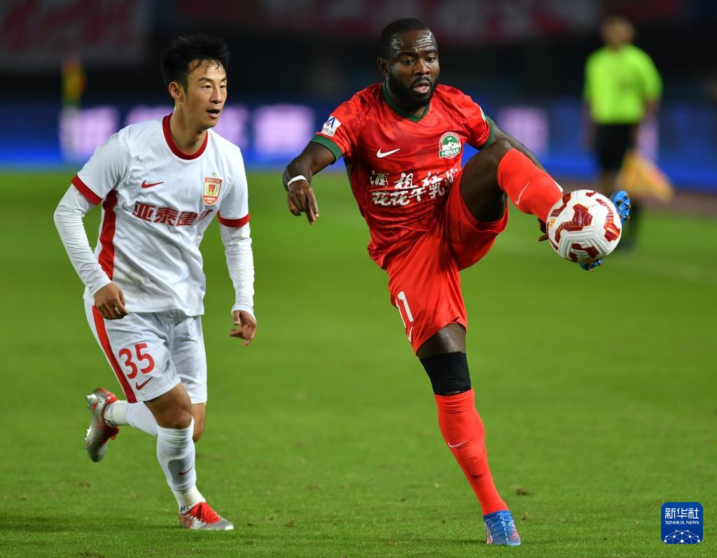 10月19日,長春亞泰隊球員奧莫伊胡安弗(前左)與河南俱樂部酒祖杜康隊球員鐘義浩(前右)拼搶。