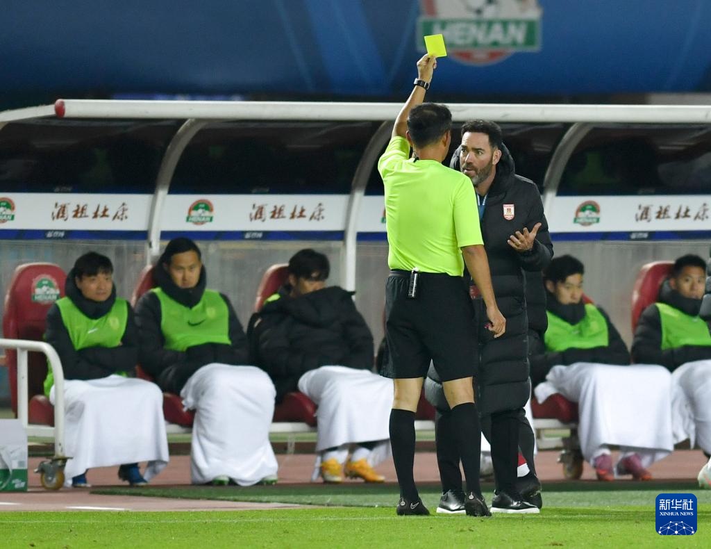 10月19日,主裁判劉威(前)向長春亞泰隊主教練蘇亞雷斯出示黃牌。