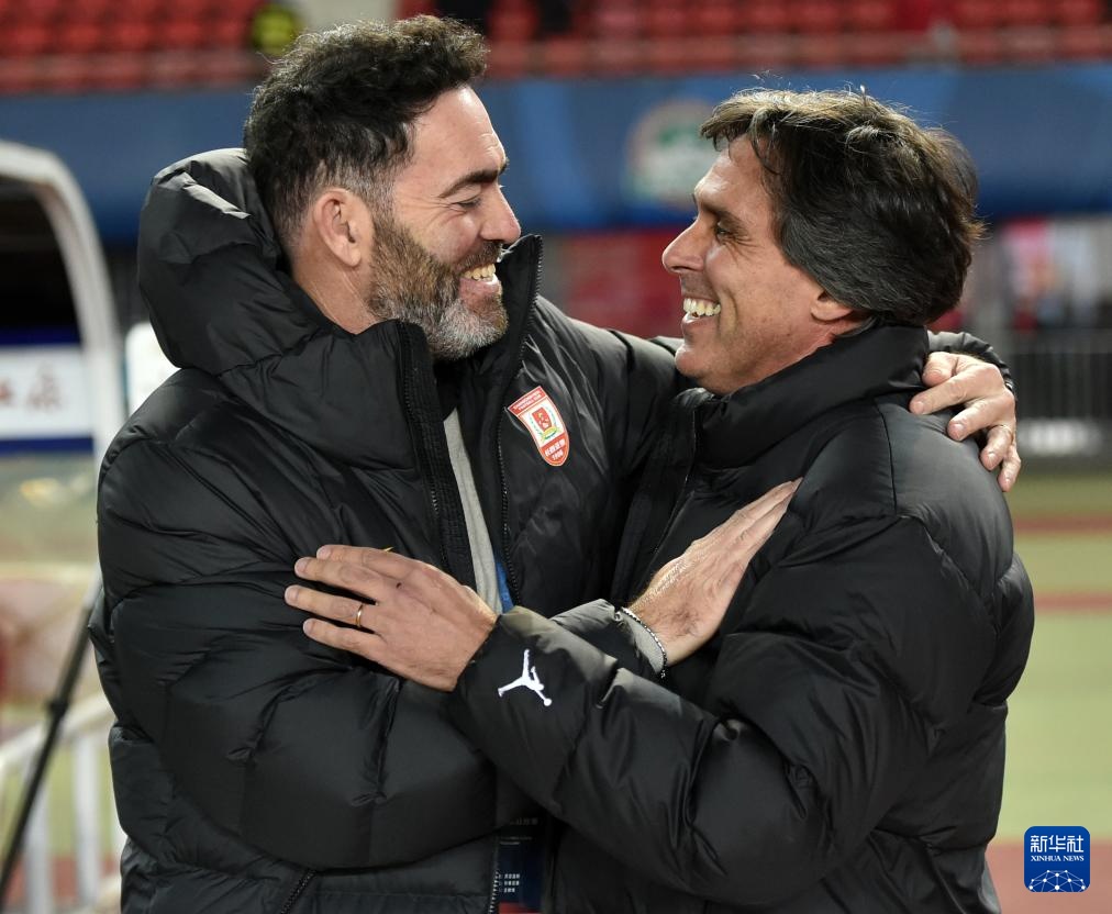 10月19日,河南俱樂部酒祖杜康隊主教練丹尼爾·拉莫斯(右)與長春亞泰隊主教練蘇亞雷斯在比賽前相互致意。