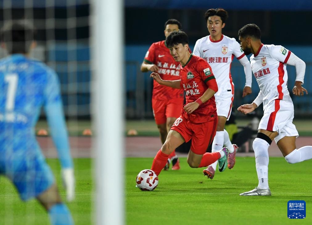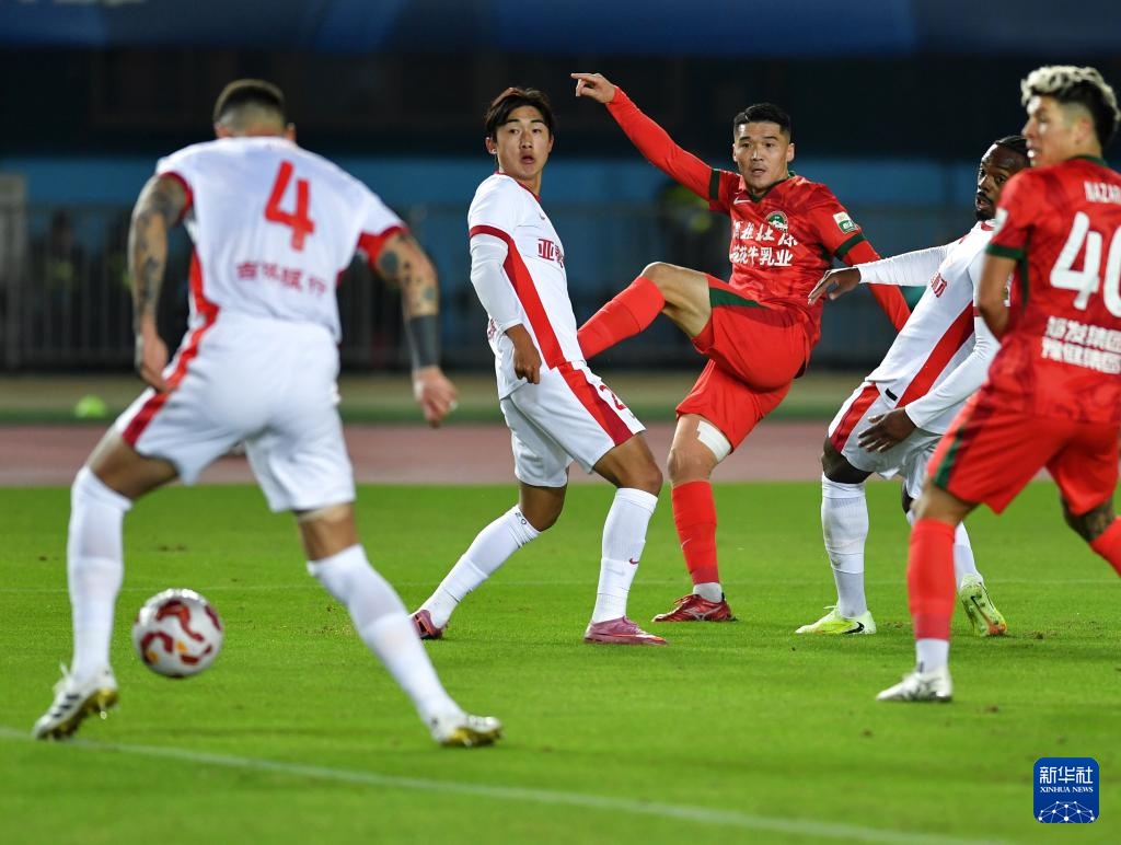 10月19日,河南俱樂部酒祖杜康隊球員鐘義浩(右三)在比賽中射門。