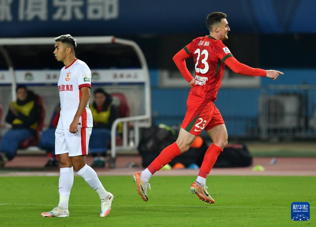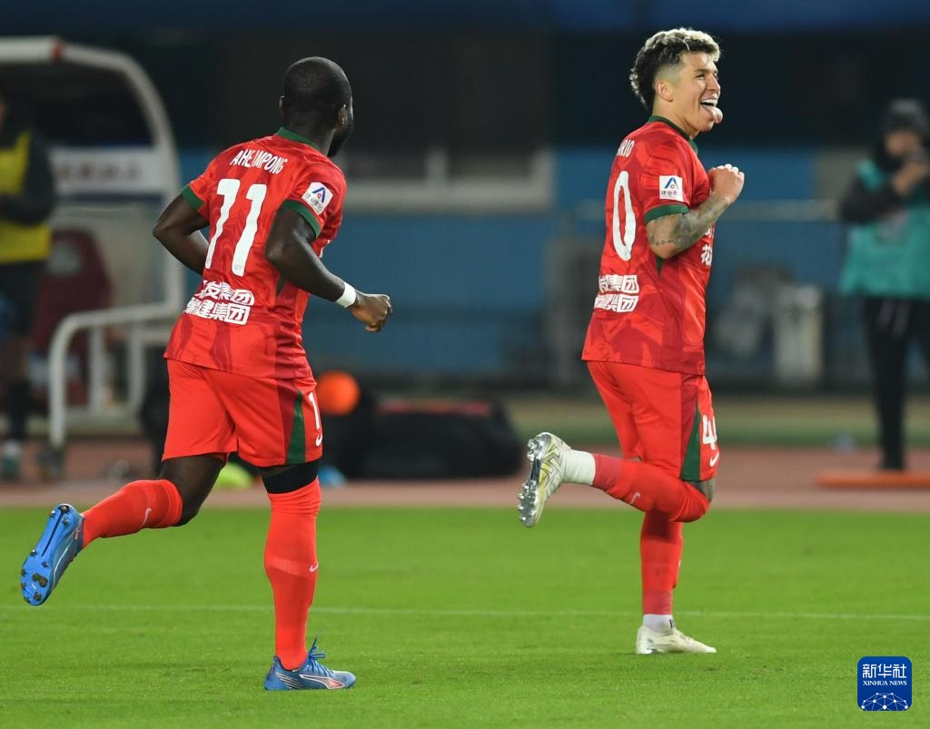 10月19日,河南俱樂部酒祖杜康隊球員盧卡斯·馬亞(右)慶祝進球。