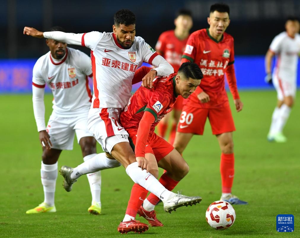 10月19日,長春亞泰隊球員西普里安(左)與河南俱樂部酒祖杜康隊球員納薩里奧(中)拼搶。