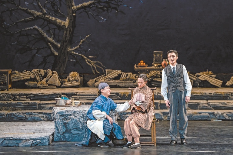 故事中的“煙火氣”則體現在兩處舞臺設置上:垂下的紗簾幕自由展現出各種城市風貌與相關故事元素;一棵高大的樹立于其中,帶來堅硬又孤零的氣息。舞美設計李彪說:“北京題材的戲,我繞不開這棵樹,是冥冥之中的感覺。”在他一直以來的感受里,老舍先生就如這樣一棵樹,“孤獨……又有生生不息的感覺,雖然是一棵冬天的沒有樹葉的樹,周圍環境也很寒冷,但樹立在那里,是又孤獨又溫馨的。”