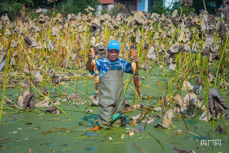 藕農挖出蓮藕(央廣網記者左洋 攝)