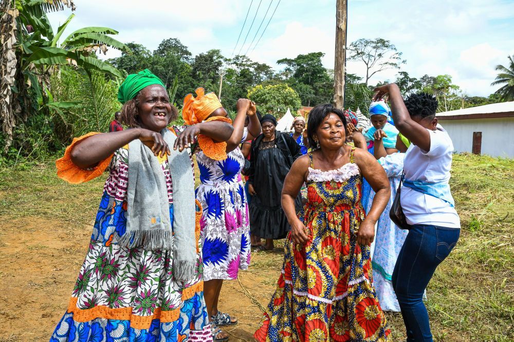 2025年10月8日,在喀麥隆松明比亞斯村,村民慶祝中國企業建設的農村離網太陽能電站項目正式啟用。新華社發(科普索攝)