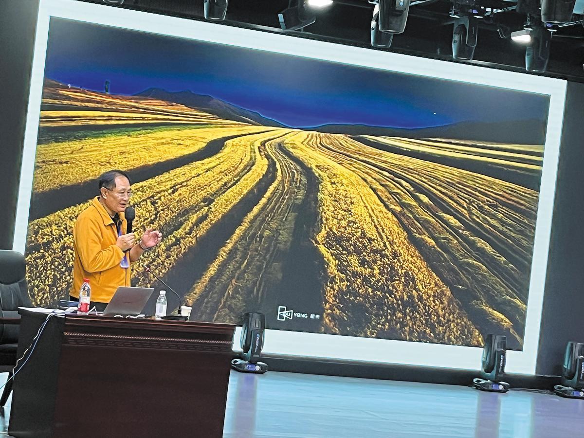 Cui Yong presents a lecture on landscape photography using drones in Hami city on Sept 21. CHEN LIANG/CHINA DAILY