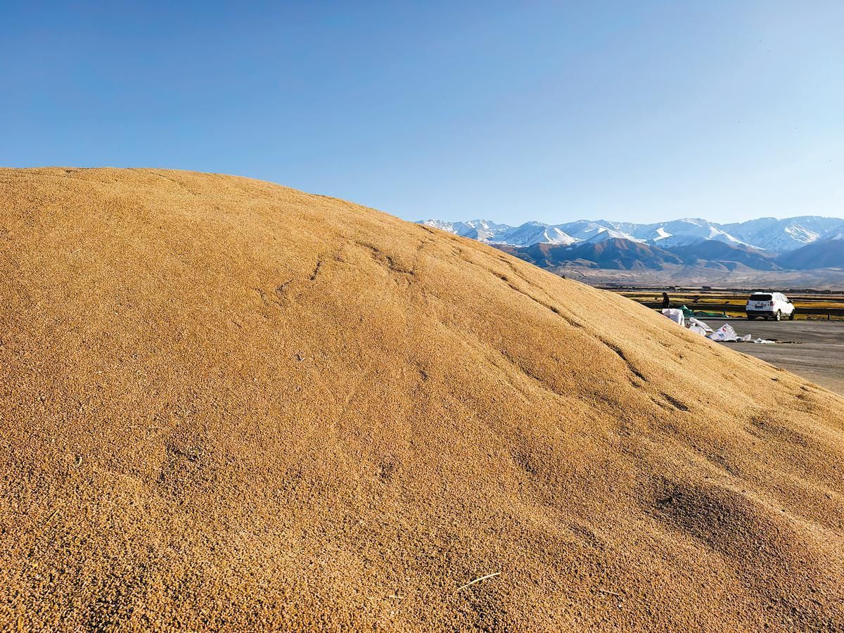 A heap of wheat is sun-dried at the Gaojia Lake Wetland in Barkol on Sept 23. WANG JUNFENG/FOR CHINA DAILY