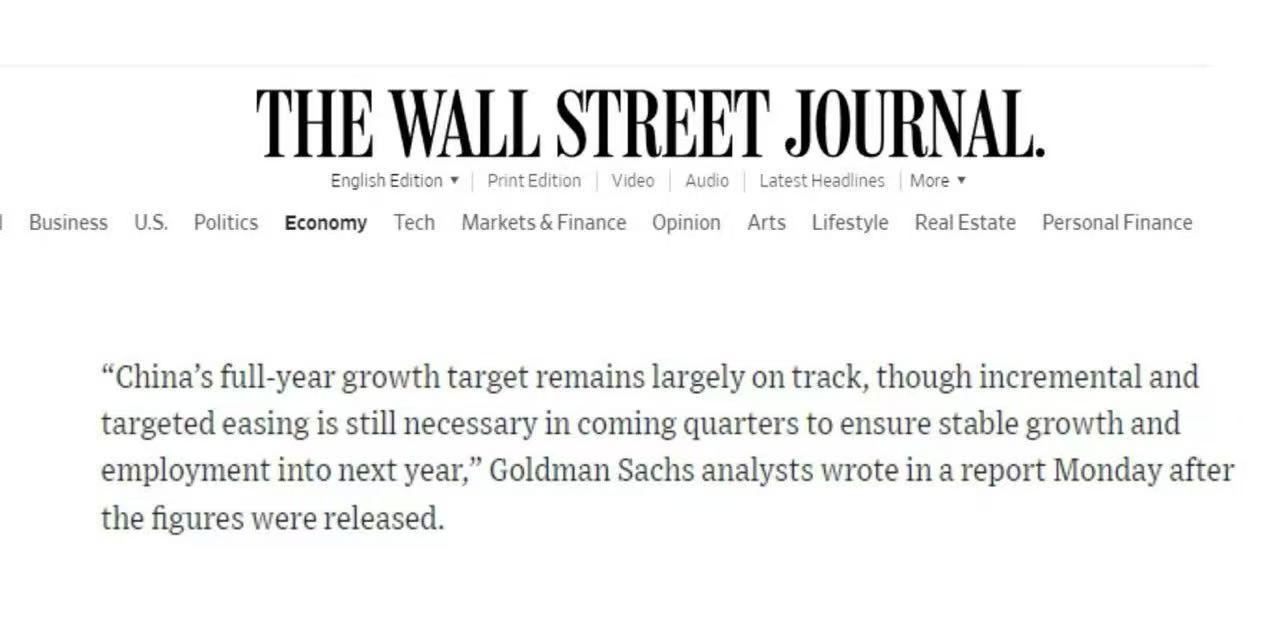 美國《華爾街日報》報道顯示,2023年前三季度中國GDP同比增長5.2%,意味著"5%左右"的年度增長目標已基本達成。報道援引高盛分析師觀點稱,雖然未來幾個季度仍需實施漸進式、結構性的寬松政策,但全年經濟增速仍將總體符合預期。