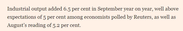 英國《金融時報》的文章分析說,9月規模以上工業增加值同比增長6.5%,顯著高于路透社調查經濟學家預期的5%及8月的5.2%。荷蘭國際集團(ING)經濟學家分析稱,超預期表現主要源于外需拉動。文章說,上周,海關數據顯示,中國出口保持韌性,9月同比增長8.3%,對東南亞等地區出口持續增長。