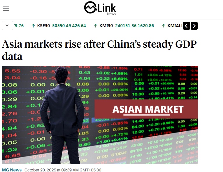 巴基斯坦金融網站Mettis Global Link發表題為《亞洲股市響應中國穩健GDP數據普漲》的文章。文章分析稱,亞洲市場20日迎來開門紅,得益于中國的最新經濟數據。中國第三季度GDP同比增長4.8%,同時維持貸款市場報價利率(LPR)。股市方面,香港恒生指數大漲逾2%,內地滬深300指數上漲0.74%。日經225指數飆升近3%,首次突破49000點大關,東證指數上漲2%。