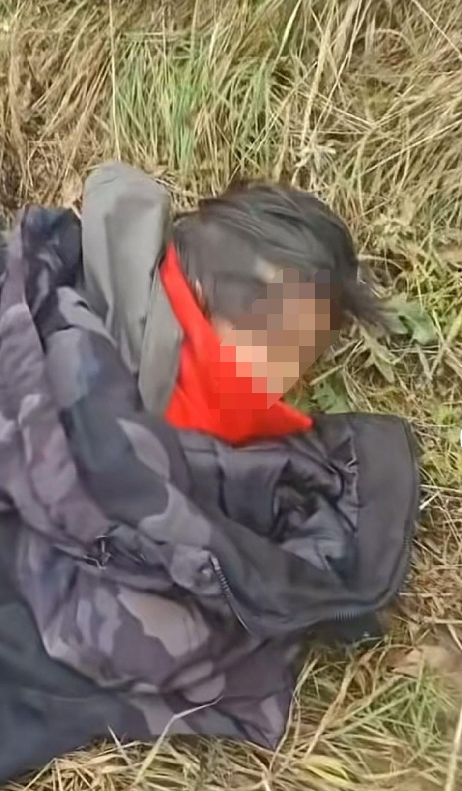 現場視頻顯示,身著紅色棉襖的丁一趴在山溝的草窩處,身體因低溫有些發抖,面部有輕微擦痕,她光著雙腳,一只鞋散落在旁邊。見此情形,王海軍和張慶濤將自己身上的衣服脫下來給孩子蓋上。