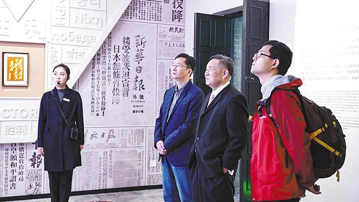 日本《赤旗報》記者小林拓也(右一)與陳德(右二)一同參觀八路軍武漢辦事處舊址紀念館。(湖北日報全媒記者 涂家駿 攝)