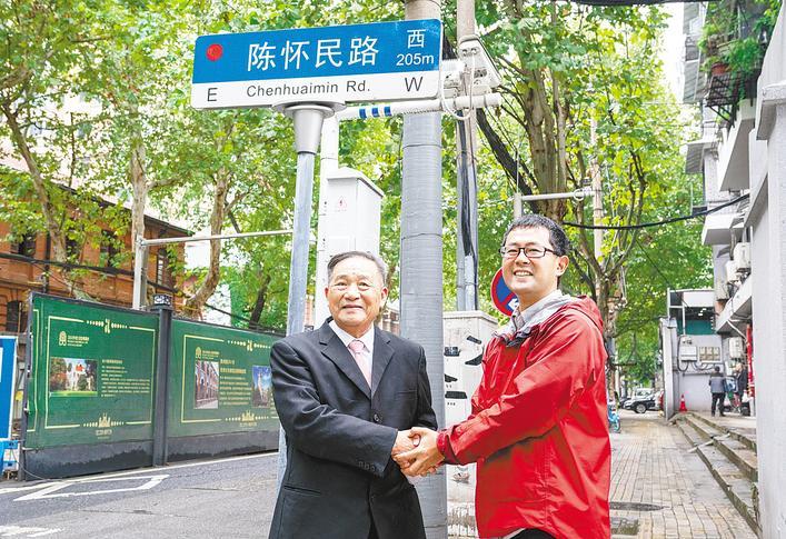 陳德(左)和小林拓也在陳懷民路路牌前合影。(湖北日報全媒記者 魏錸 攝)