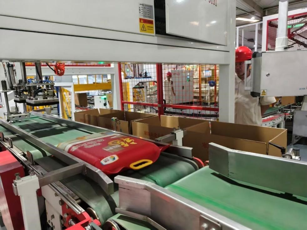 糧食生產(chǎn)線上,一袋袋大米被打包入箱。人民網(wǎng)記者 李棟攝