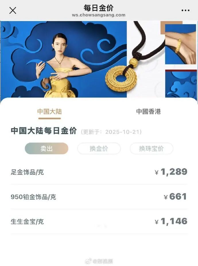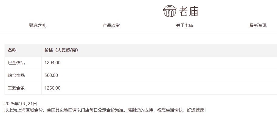 10月21日,國內金飾價格跟漲。記者查詢發現,老廟黃金金飾品克價漲至1294元。