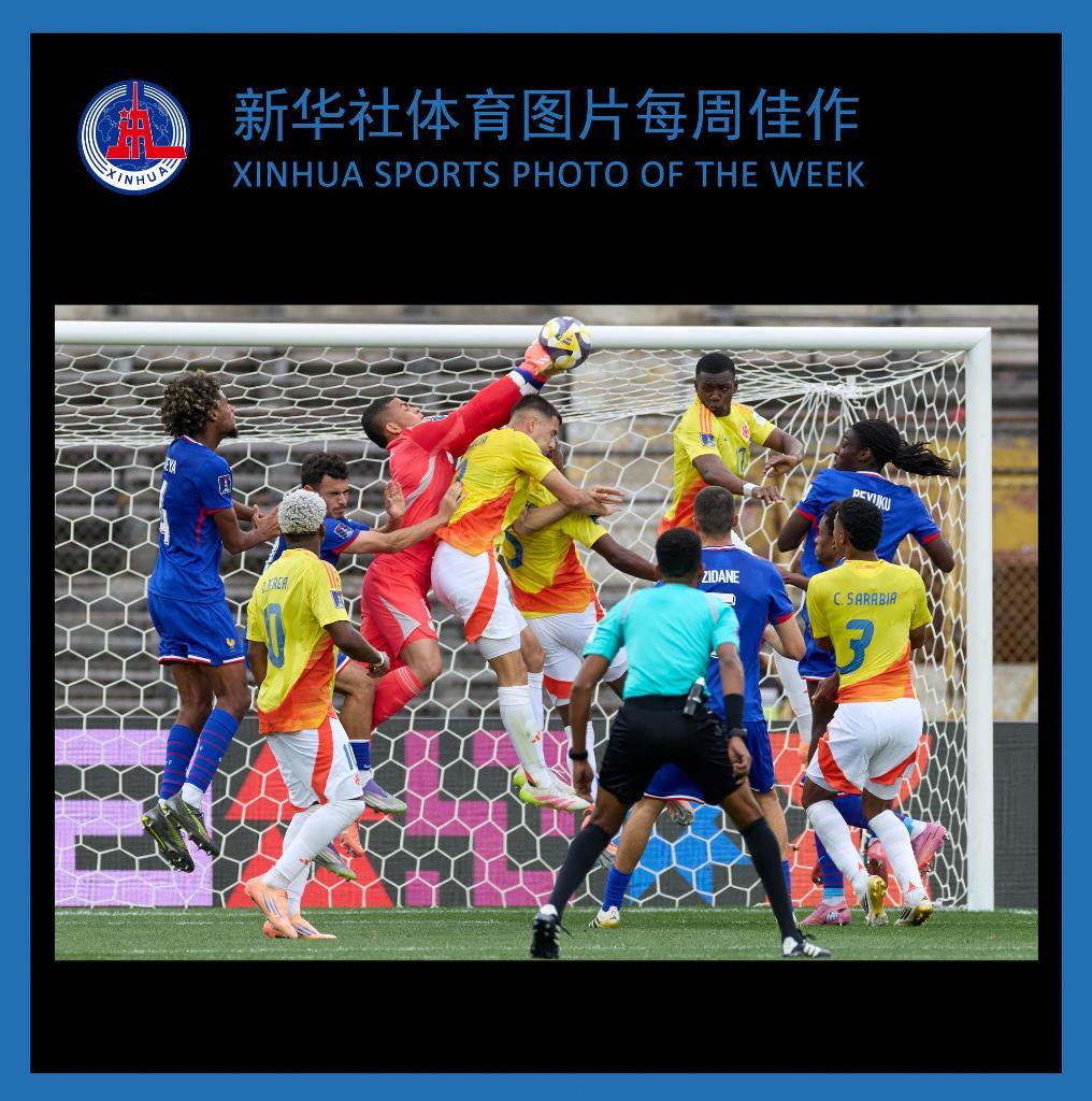 10月18日,哥倫比亞隊門將加西亞(左四)在比賽中撲救。當日,在智利圣地亞哥進行的2025國際足聯U20男足世界杯三四名決賽中,哥倫比亞隊1比0戰勝法國隊,獲得季軍。