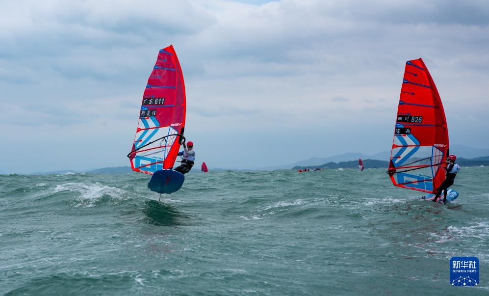 10月20日,廣東隊選手鄭曼佳(左)和四川隊選手陳雨在女子水翼帆板級比賽中。