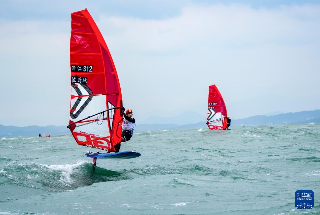 10月20日,浙江隊選手池清斌(左)在男子水翼帆板級比賽中。