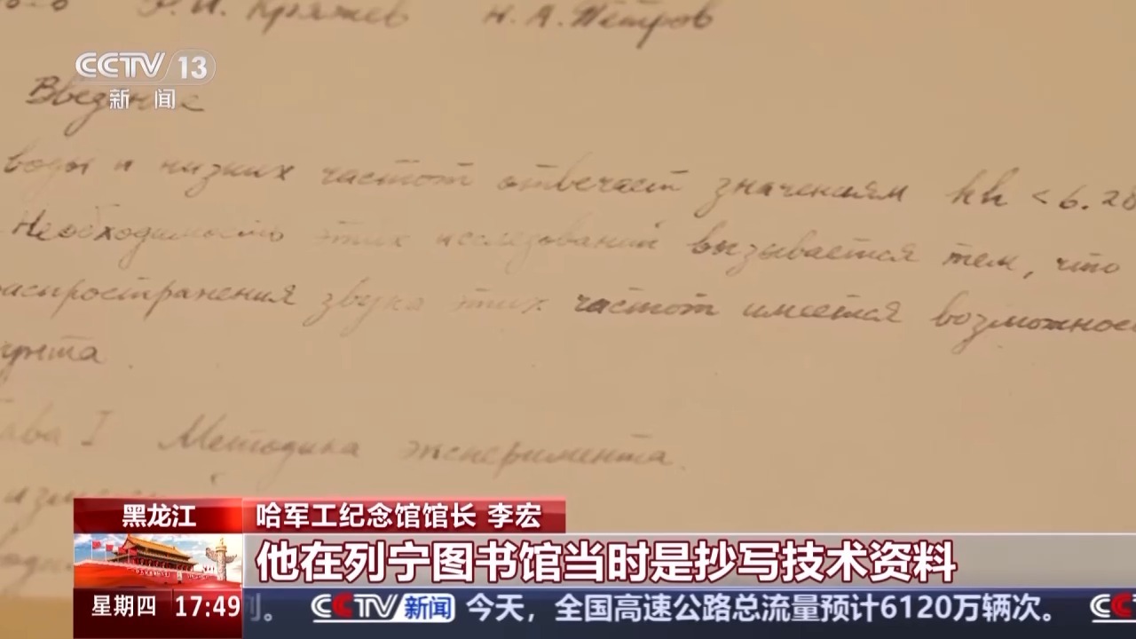 哈軍工紀念館館長 李宏:這是楊士莪院士用4種語言寫的一份科研手稿,1956年楊士莪院士到蘇聯(lián)去留學,他在列寧圖書館抄寫技術資料,我們也曾問過院士為什么要用4種語言來抄寫這樣技術資料?他說只有掌握語言,才能夠精準地掌握最前沿的技術資料。