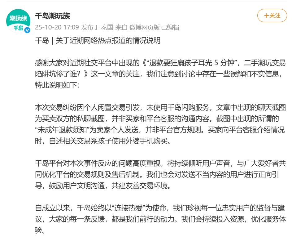 10月20日,@千島潮玩族 發(fā)布關(guān)于近期網(wǎng)絡(luò)熱點(diǎn)報(bào)道的情況說明:感謝大家對(duì)近期社交平臺(tái)中出現(xiàn)的《“退款要狂扇孩子耳光5分鐘”,二手潮玩交易陷阱坑慘了誰?》這一文章的關(guān)注,我們注意到討論中存在一些誤解和不實(shí)信息,特此說明如下: