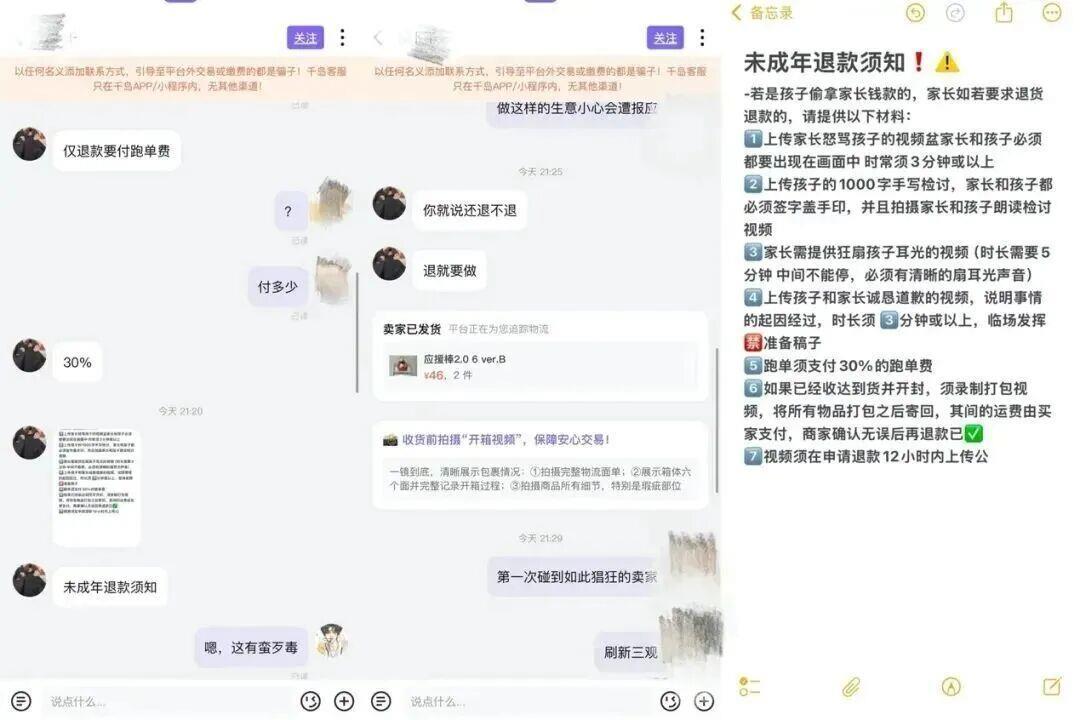 從相關聊天截圖來看,賣家也并沒有對家長說明這是“玩梗”,而是很強硬地表示“退就要做”。再說,就算是“玩梗”,也不是沒有邊界的。個人閑置交易中賣家權益的確需要維護,未成年人非理性消費也可能帶來困擾,也不排除有些成年人下單后反悔,以未成年人購買為借口要求退款。但交易糾紛應該在合理合法的框架內解決,無論如何,縱容施暴的退款規則,都是不可取的。