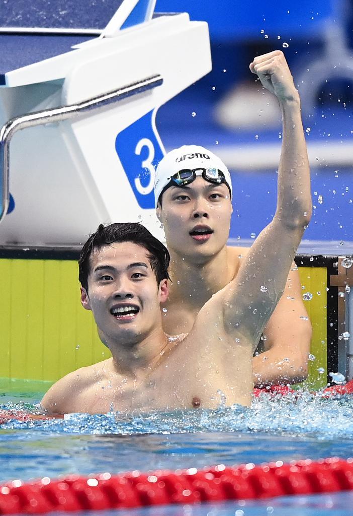 2023年9月27日,韓國選手黃宣優(前)在杭州亞運會游泳項目男子200米自由泳決賽后慶祝奪冠。新華社記者 黃宗治 攝