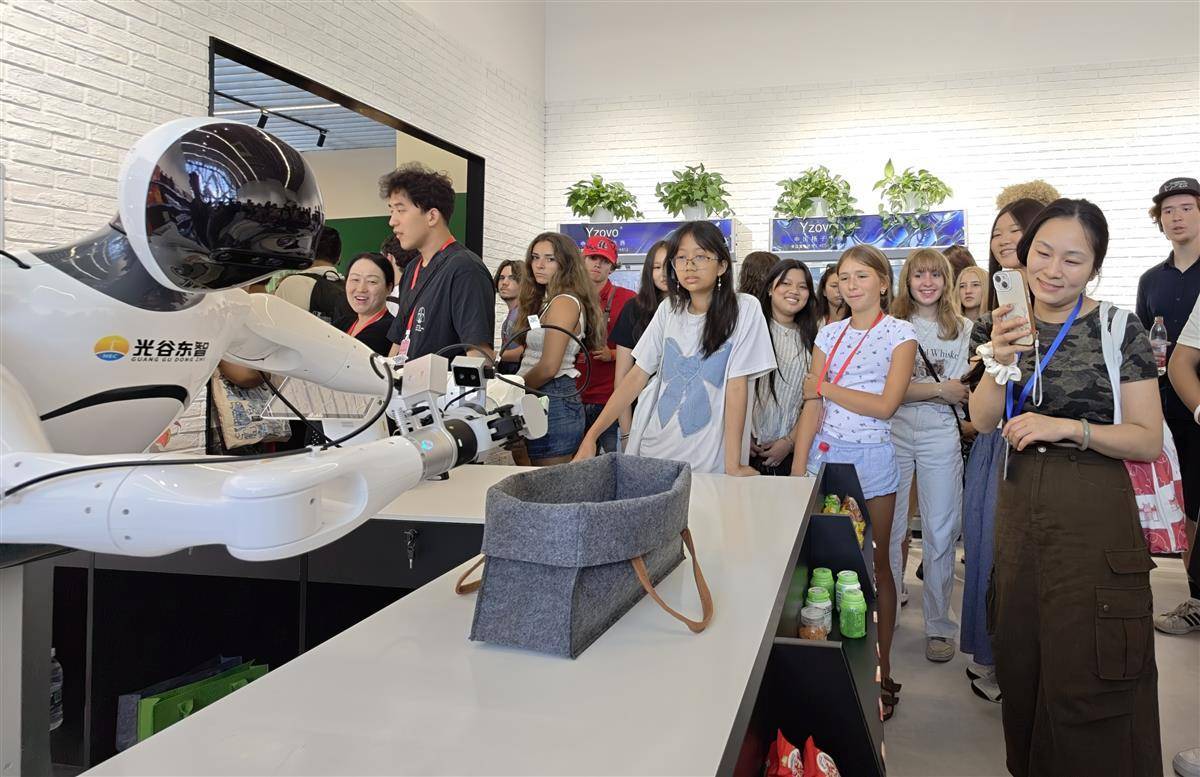 2025年7月29日上午,近百名美國“飛虎隊”青少年夏令營成員走進湖北人形機器人創新中心,深入體驗了人形機器人的生活應用場景,紛紛點贊湖北尖端機器人技術成果。(湖北日報全媒記者 陳少哲 攝)