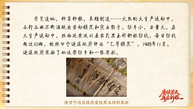 開荒造地,種菜種糧,養(yǎng)殖制造……火熱的大生產(chǎn)運(yùn)動(dòng)中,各行各業(yè)不斷涌現(xiàn)出勞動(dòng)模范和突擊能手。紡車小,力量大。在大生產(chǎn)運(yùn)動(dòng)中,陜西延安延川縣農(nóng)民黑玉祥積極紡線,每日紡線超過10兩,被陜甘寧邊區(qū)政府評(píng)為“乙等模范”。1943年11月,邊區(qū)政府獎(jiǎng)勵(lì)了她這架紡車和一張獎(jiǎng)狀。