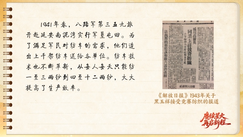 1941年春,八路軍第三五九旅開赴延安南泥灣實(shí)行軍墾屯田。為了滿足軍民對(duì)紡車的需求,他們?cè)斐錾锨Ъ芗徿囁徒o各單位。紡車技術(shù)也不斷革新,從每人每天只能紡一至三兩紗到四至十二兩紗,大大提高了生產(chǎn)效率。
