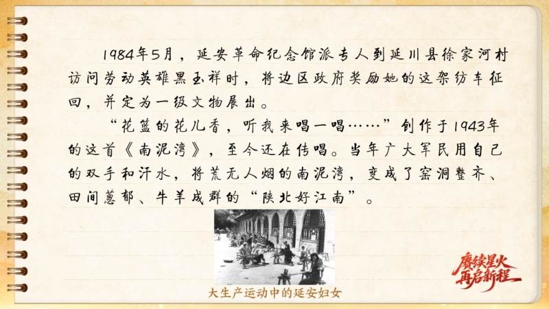 當(dāng)時(shí),黨中央號(hào)召全體軍民自己動(dòng)手、豐衣足食,在邊區(qū)開展轟轟烈烈的大生產(chǎn)運(yùn)動(dòng)。從那時(shí)起,會(huì)紡線成了延安人民日常生活所需,紡車走進(jìn)千家萬戶。“新三年,舊三年,縫縫補(bǔ)補(bǔ)又三年”,成為當(dāng)時(shí)人們?nèi)粘I畹恼鎸?shí)寫照。