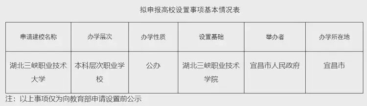根據《中華人民共和國高等教育法》《中華人民共和國職業教育法》《本科層次職業學校設置標準(試行)》《教育部關于“十四五”時期高等學校設置工作的意見》等有關規定,經評議,現對擬向教育部申報設置“湖北三峽職業技術大學”事項予以公示。
