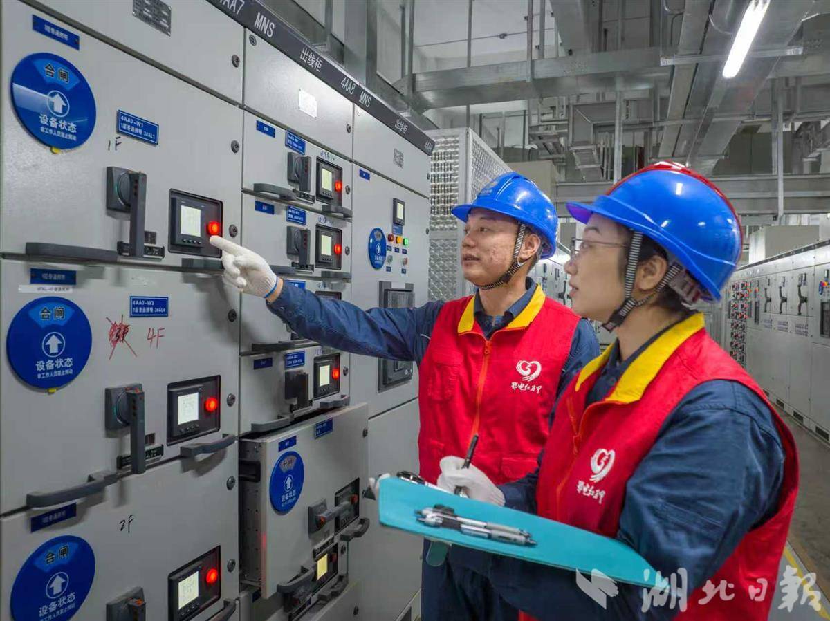 國(guó)網(wǎng)湖北電力員工在鄂州市葛店開(kāi)發(fā)區(qū)檢查瑞華光電等高科技企業(yè)供電設(shè)施,保障電力可靠供應(yīng)。(陳軍、丁小波攝)