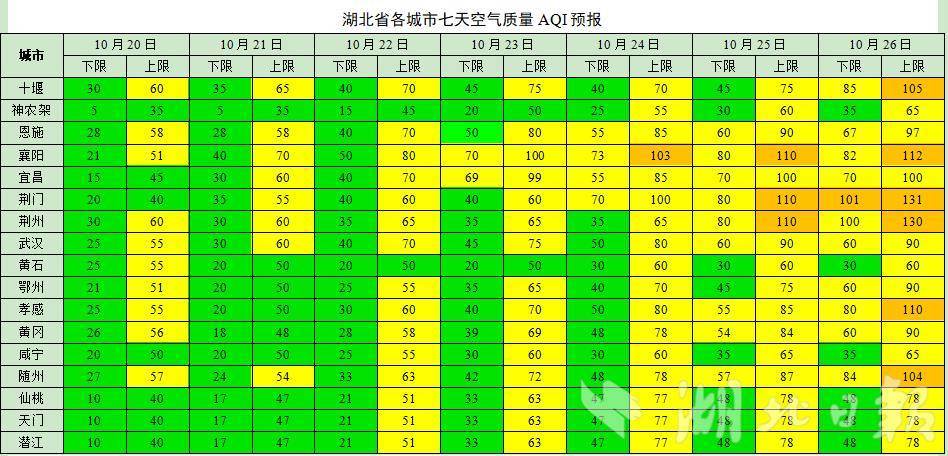 湖北日報訊(記者劉鄲、通訊員李斌)10月20日,湖北省生態環境廳發布最新空氣質量預測:預計本周,21日持續陰雨天氣逐步結束,21至26日全省以晴到多云為主,風速逐漸減小,氣象條件逐步轉差,PM2.5濃度逐步抬升,26日可能有一次輕度污染過程,具體預報如下: