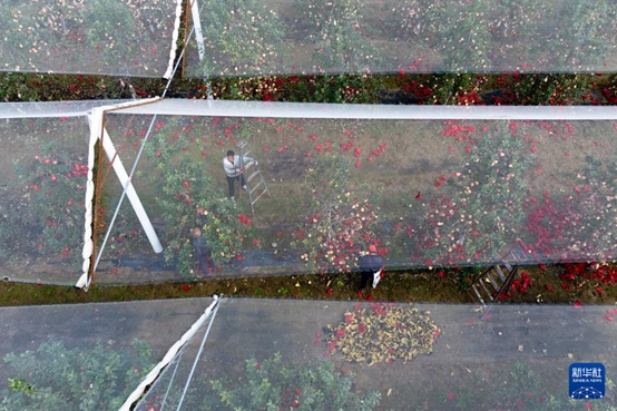 果農(nóng)在延安市寶塔區(qū)橋溝街道煙洞溝村蘋果園內(nèi)勞動(dòng)。圖源:新華社