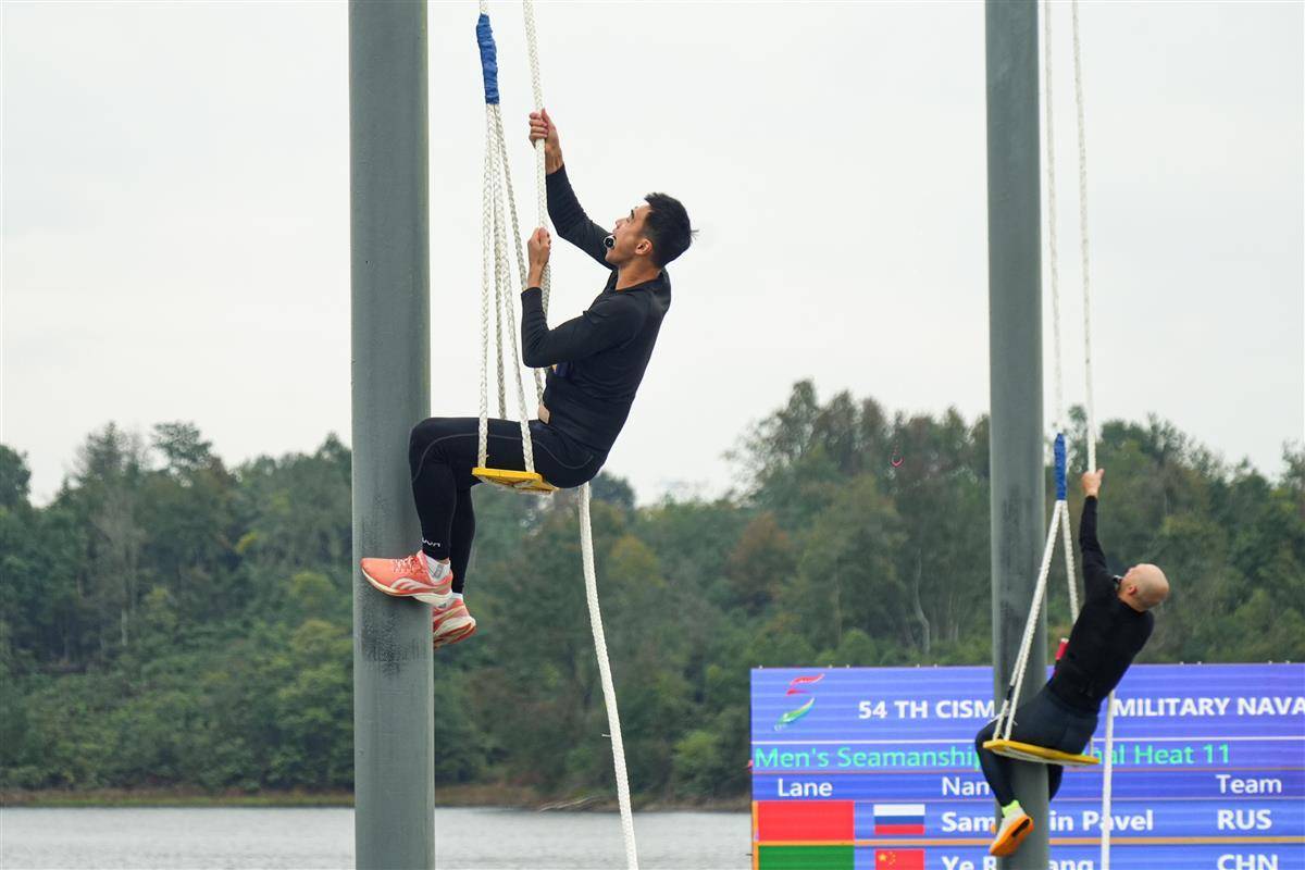 桅桿高聳,浪花飛濺,參賽選手爬上6米高的桅桿,迅速將5根不同顏色的木梢精準插入對應顏色的孔中。10月21日,國際軍體第54屆海軍五項世界錦標賽航海技術賽在海軍工程大學木蘭湖校區(qū)進行。