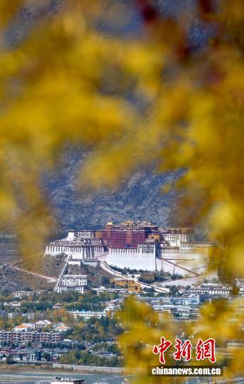 10月20日,西藏拉薩深秋如畫(huà)。圖為拉薩天堂草原自然風(fēng)景區(qū)的黃葉與布達(dá)拉宮相映成趣。中新社記者 李林 攝