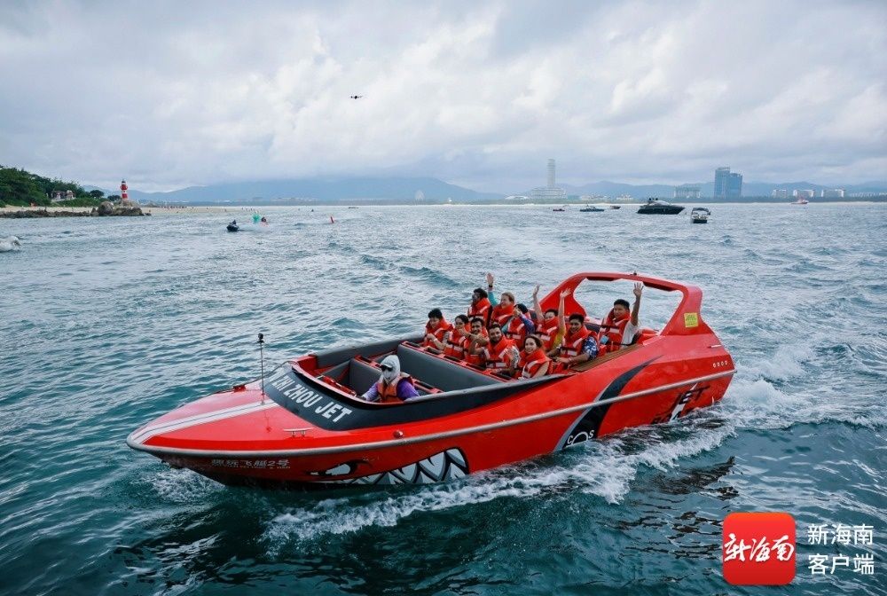 海南旅游國際推薦官乘坐“動感飛艇”,感受水上運動的激情與活力。記者 李昊 攝