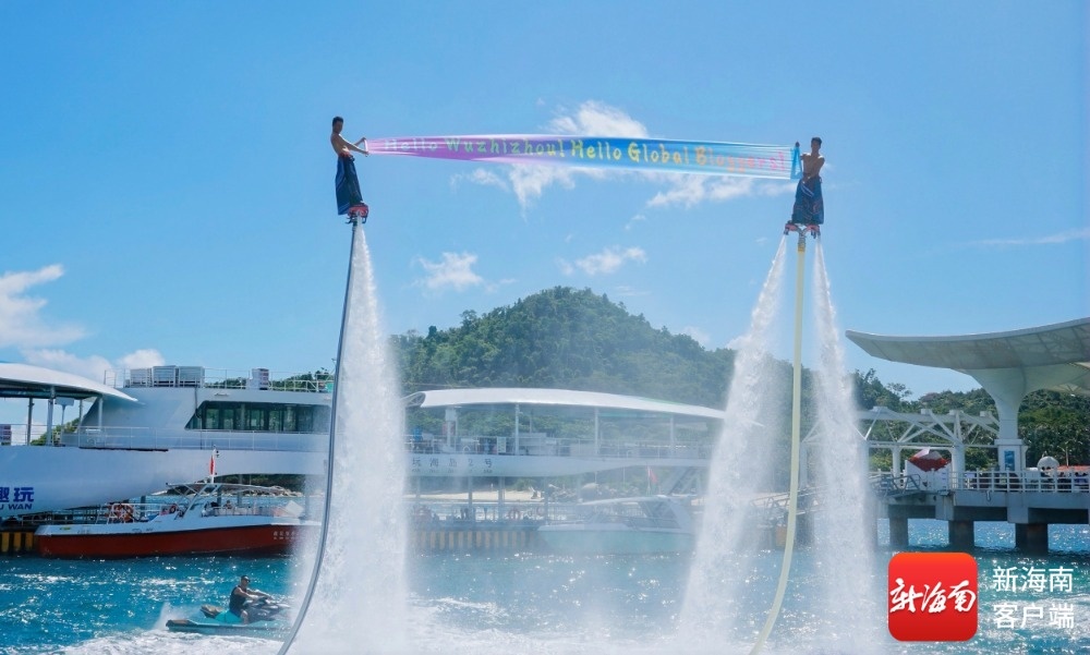 “Hello Wuzhizhou!Hello Global Bloggers!”10月14日,海南旅游國際推薦官到訪三亞,登船前往蜈支洲島。剛下船,博主們便被景區量身打造的接待現場所打動:兩名水上飛人踩著噴射裝置騰空,將歡迎橫幅展開在碧海藍天間,還有表演者在海面騰空翻轉,引得博主們紛紛駐足拍攝,連連感慨“景區的歡迎儀式太令人感動了,也非常驚喜!”