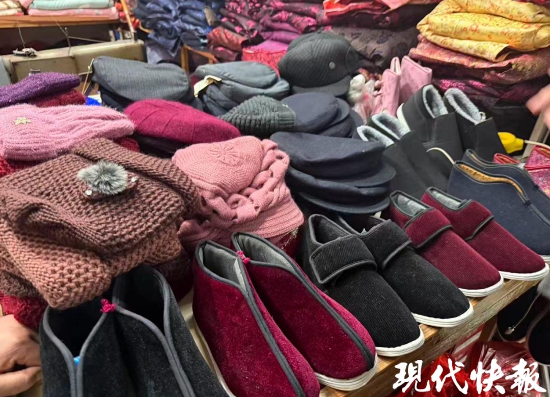 小店不僅賣壽衣,還賣帽子、鞋子等日常穿著用品,而且帽子、鞋子等日常物品就擺放在店門口顯眼位置。