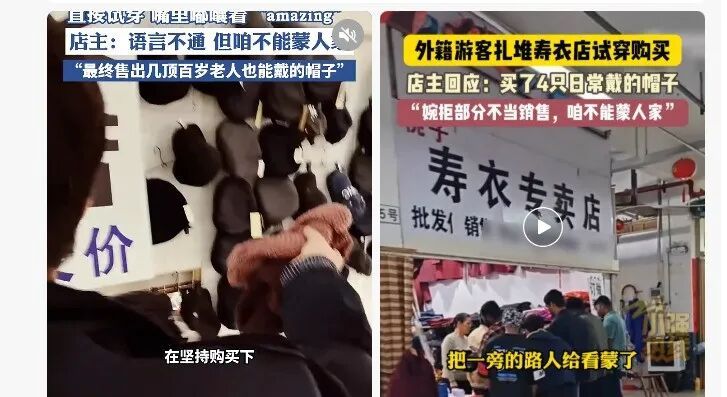 “那天,幾個外國人先在我妹妹那邊看鞋子,還價,沒買,然后就到我的店里,直接挑了帽子,從頭到尾沒有提要買壽衣。”耿女士告訴記者。“他們中有人會說簡單的中文,還在手機計算器上按數字還價,我報價25元一頂帽子,他們一開始還價10元、12元我沒賣,最后是15元一頂帽子成交的,他們一共買了四頂普通的帽子。”