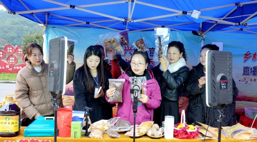 比賽現場,22支參賽隊伍按村干部組和社會組兩個組別展開角逐。各直播間內,主播們手持干菜、臘貨等農特產品,面對鏡頭細致講解。后臺運營團隊同步跟進訂單數據,保障流程順暢。現場氣氛熱烈,觀眾不時舉起手機為心儀主播點贊助威,當天總成交金額高達17萬余元。通過此次直播帶貨大賽,一批優秀村播和網紅達人脫穎而出,一批家鄉農產品借“屏”走紅。