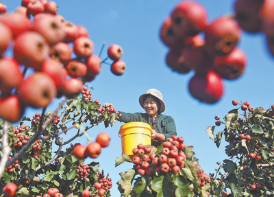 山東省淄博市沂源縣悅莊鎮崔家莊村,農民在采摘山楂。趙東山攝(影像中國)