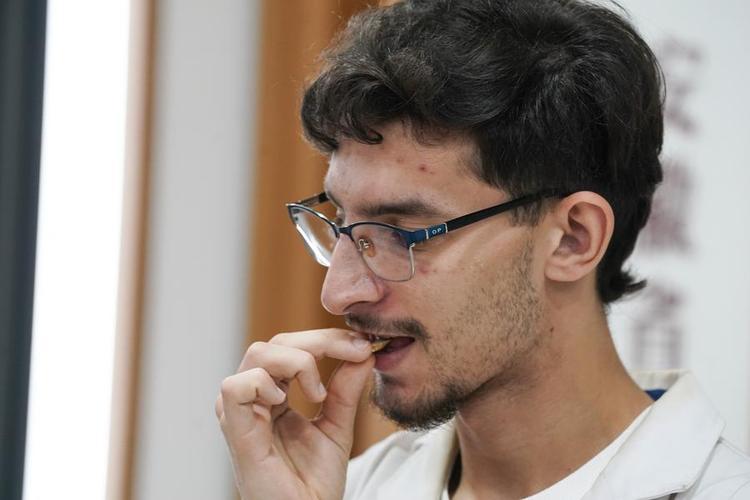 Kerbouche Abdeldjalil learns to identify the traditional Chinese herb Huangqi, or Astragalus root, at Anhui University of Chinese Medicine in Hefei, east China's Anhui Province, Oct. 16, 2025. (Xinhua/Du Yu)