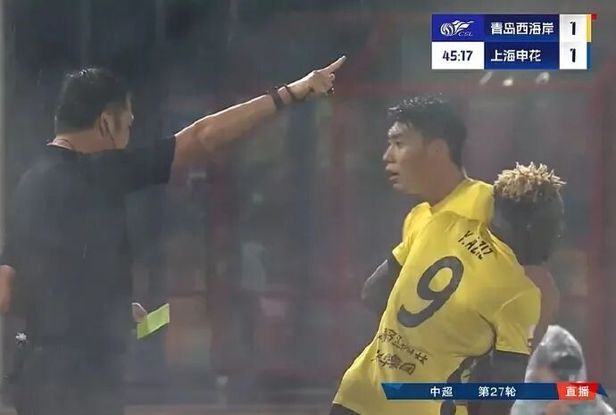 據東方體育日報,中超第27輪,上海申花對陣青島西海岸的比賽第45分鐘,張呈棟由于邊裁爭議舉旗追著邊裁罵,最終被紅牌罰下。