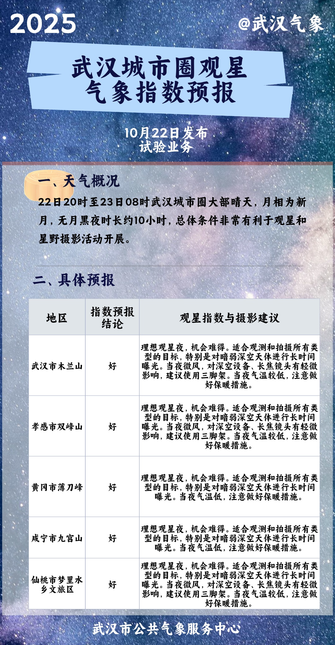 湖北日報訊(記者湯煒瑋、通訊員汪健健)10月22日,武漢市第一期觀星氣象指數預報出爐:今天夜間武漢城市圈大部晴朗無云無月,有3個活躍流星群:獵戶座流星雨、金牛座北流星雨、金牛座南流星雨。